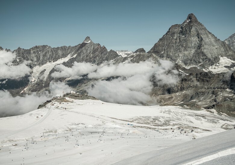 Des remontées mécaniques modernes vous conduisent de Zermatt jusqu’au sommet, à 3'883 m d’altitude. Grâce à un enneigement assuré toute l’année, les descentes y sont du meilleur niveau. Il n’est pas rare de partager une télécabine avec une célébrité des sports d’hiver qui profite des pistes parfaitement préparées pour s’octroyer des descentes aussi vertigineuses que grisantes. À Zermatt, la proximité des sommets va souvent de pair avec celle des stars! Plus de cent équipes de 22 nations entraînent leurs talents au glacier du Théodule et se préparent déjà à la saison d’hiver.